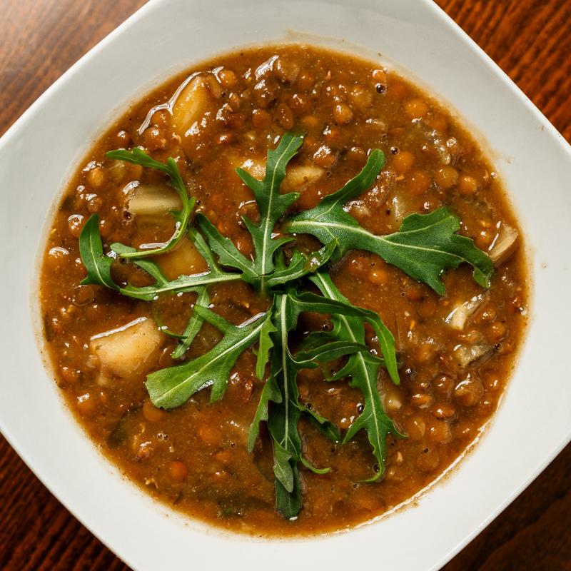 Escarole, celery, potatoes in a seasoned lentil & coriander broth