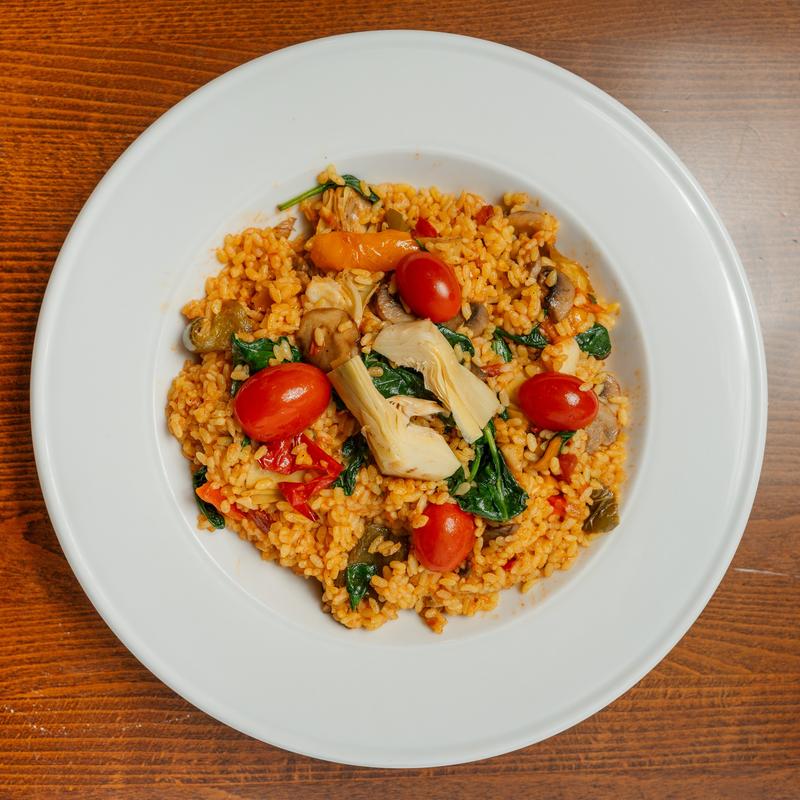 Saffron rice, artichokes, roasted peppers, mushrooms, spinach