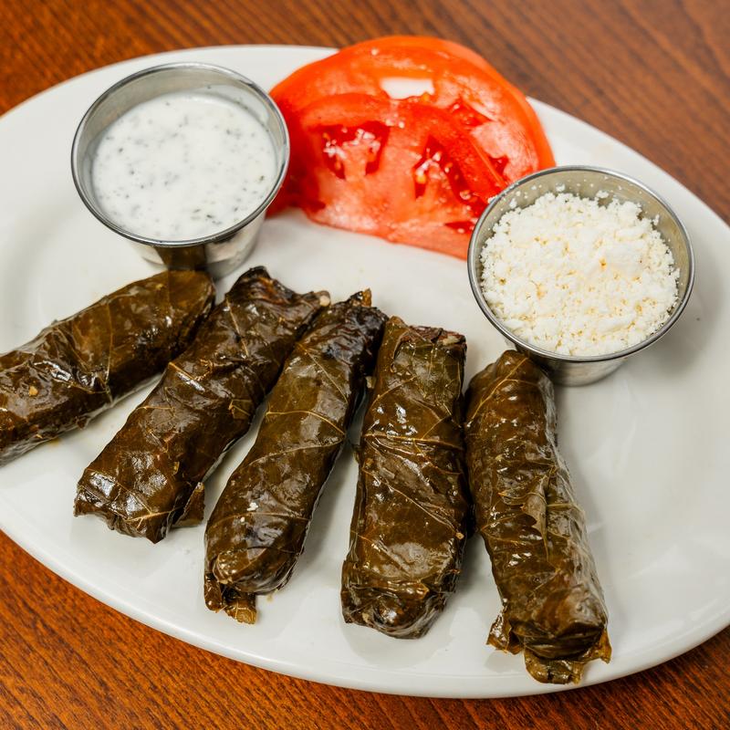 Herb seasoned rice wrapped in grape leaves topped with feta & a side of tzatziki