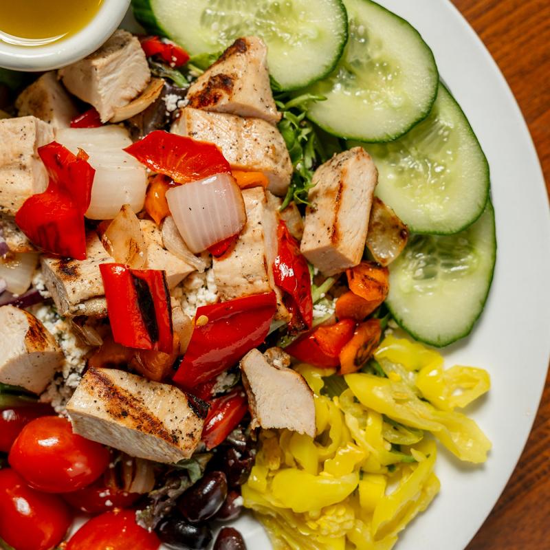 Tomatoes, roasted onions & peppers, feta & Greek dressing | Add a side +$4.00